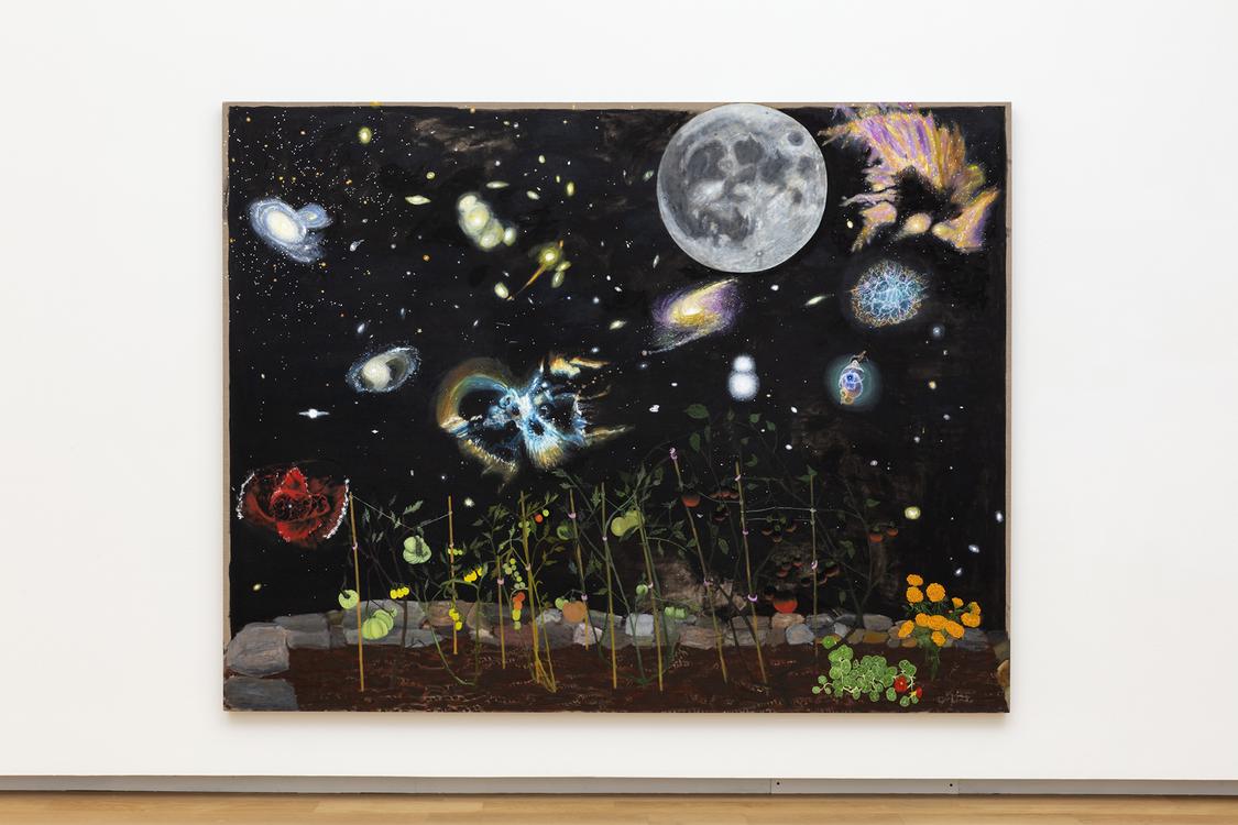 其他作品则是银河世界、微小的风景、仰望天空或穿越中距离的一瞥。在《原始泥浆》(Primordial Ooze)中,一个传统佛教保护神的尖牙和嘴压在一个人的身上。这是自我的转变。这些守护者被理解为吞噬世俗世界,当我们在邱奇曼的图像宇宙中看到时,他们是一种安慰,也是一种威胁。