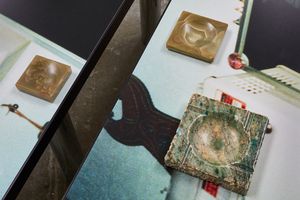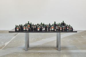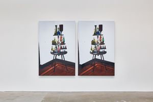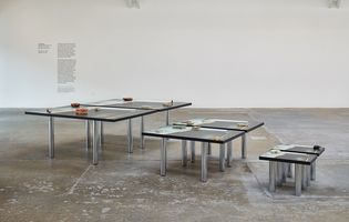 Yuki Kimura traduit des idées abstraites en objets tangibles. Son approche conceptuelle consiste à emprunter des éléments à l'architecture, au design, à la photographie et à la sculpture pour matérialiser l'immatériel. Elle utilise souvent des photographies trouvées, mais leur sujet, leur composition et leur contexte sont subordonnés à leur présence en tant qu'objets physiques. Les éléments de cette exposition de nouvelles œuvres sont doublés et multipliés. Des paires de photographies sont agrandies à l'échelle humaine et accrochées côte à côte sur un mur ou transformées en plateaux de table assortis. Des cendriers et des bouteilles d'alcool sont dispersés sur ces tables comme des constellations ou des modèles architecturaux. Les images jumelles identiques font référence à un gâteau de riz japonais traditionnel du Nouvel An qui représente l'idée d'un miroir, ainsi qu'à un concept philosophique occidental du temps dans lequel le passé et le présent sont entrelacés. S'ouvrant une année et se terminant une autre, l'exposition entière agit comme une décoration du Nouvel An.