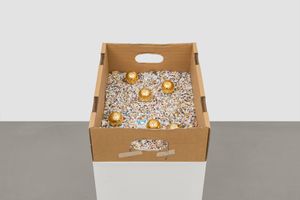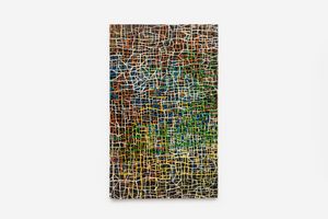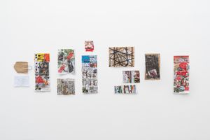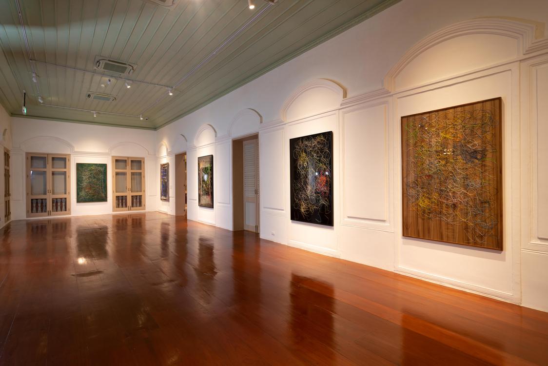 Udomsak Krisanamis compose ses tableaux en superposant des couches de matériaux sans hiérarchie : papiers, journaux, cartons, contre-plaqué, nouilles, acrylique, encre... Dans cette exposition, tous ces matériaux sont recyclés, puis transformés. Ils sont appréciés non pour leurs usages initiaux ou leur source, mais pour leur forme et leur couleur. Les œuvres, réalisées avec une précision hypnotique, évoquent des réseaux ou encore des partitions musicales, où sont mises en avant des formes rondes, rappelant des notes de musique, des constellations ou des motifs ornementaux. Ces ronds sont principalement recherchés dans les textes, les lettres et les chiffres. Dès le début de sa carrière, Udomsak Krisanamis crée un lien avec les langues qu’il apprend en barrant les mots qu’il comprend. De cette technique ont émergé des dessins segmentés, utilisés comme arrière-plan dans ses compositions. Avec ce processus, les textes des journaux deviennent lignes et grilles, rejetant toute narration linéaire au profit d’une lecture intuitive et méditative.